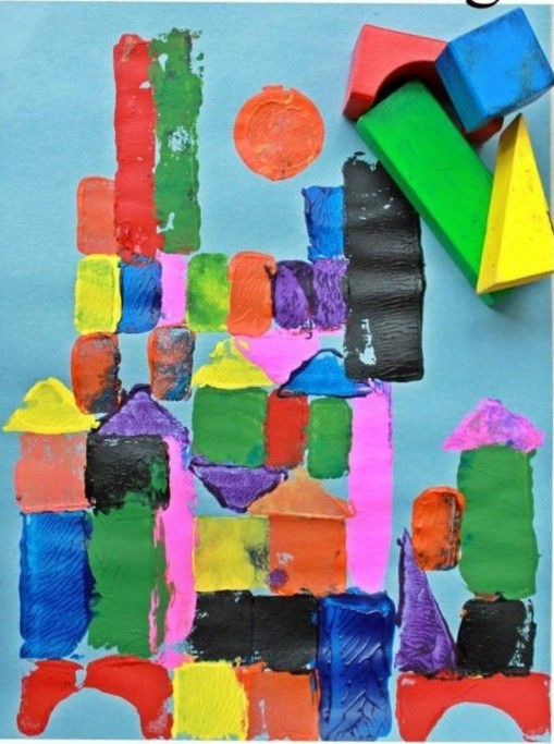 Drvenim kockicama ali i spužvicama možete otiskivati temperom razne oblike i tako stvoriti sliku našega grada.